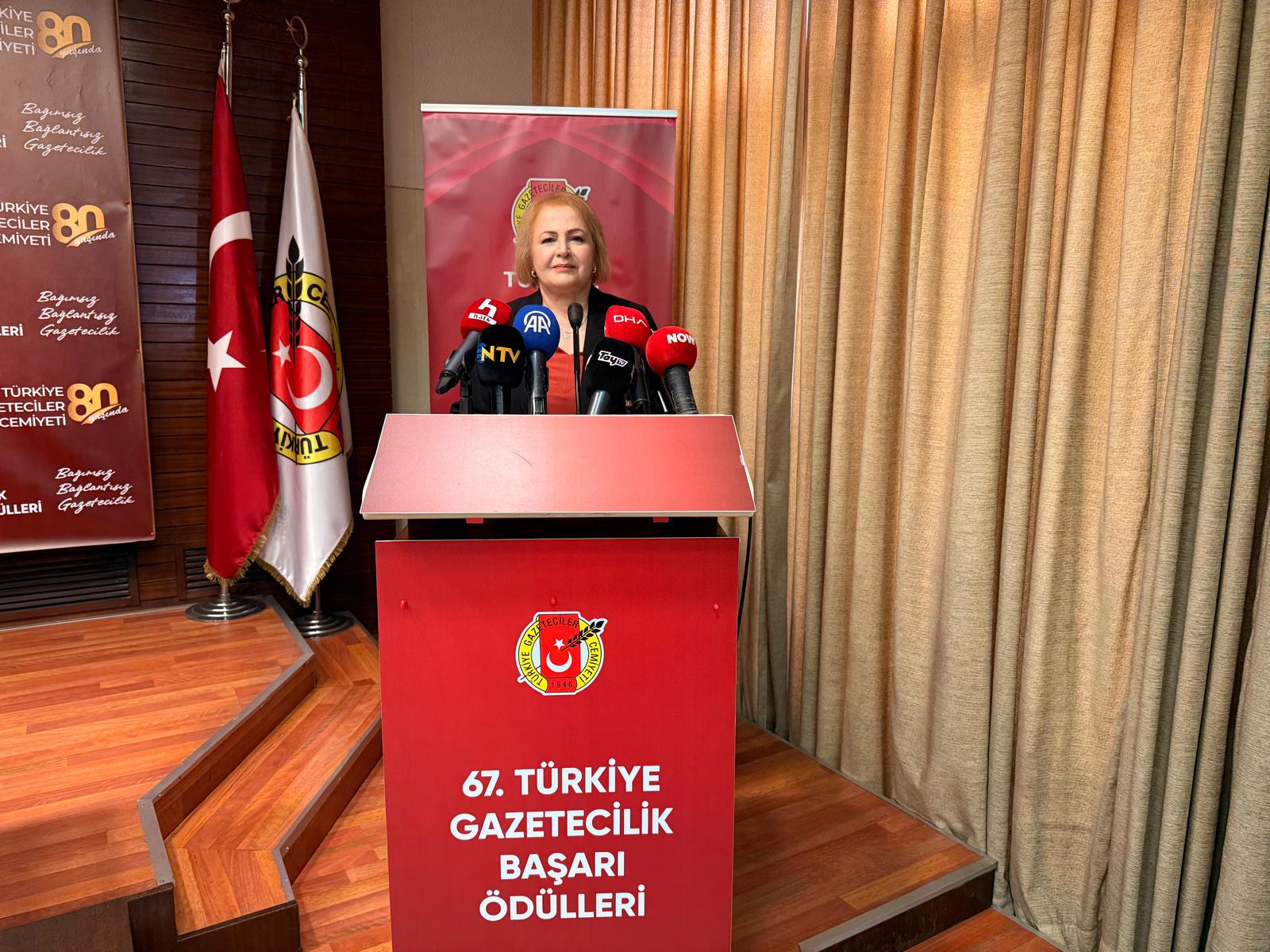 “Türkiye Gazeteciler Cemiyeti 1946 yılından bu yana bağımsız, bağlantısız gazetecilik anlayışıyla görev yapmaktadır. Her siyasi görüşten gazetecinin mesleğini özgürce icra edebilmesi, basın ve düşünceyi ifade özgürlüğü önündeki engellerin kaldırılması için kararlılıkla çalışıyoruz. Kuruluşumuzun 80. yılında da haberin serbest dolaşımı için verdiğimiz mücadeleyi üyelerimizle birlikte sürdürürken; demokrasinin ayrılmaz bir parçası olan temel hak ve özgürlüklerimize sahip çıkmayı, insani değerler ve evrensel hukuk ilkeleri çerçevesinde bir sorumluluk olarak görüyoruz. Kadınıyla, erkeğiyle tüm yurttaşlarımızın eşit, adil ve onurlu bir yaşam hakkını savunuyoruz. Bugün Türkiye Gazeteciler Cemiyeti olarak düzenlediğimiz 67. Türkiye Gazetecilik Başarı Ödülleri Töreni’nde sizlerle buluşmanın mutluluğunu yaşıyoruz. Yaygın ve yerel medyada, haberin yurttaşlara ulaşması için büyük bir özveriyle çalışan; her türlü baskıya rağmen gerçeğin izini sürmekten vazgeçmeyen meslektaşlarımız huzurlarınızda ödüllerini alacaklar. Bu ödüller yalnızca mesleki başarıyı değil, aynı zamanda kamu yararını gözeten, insan haklarına saygılı ve toplumsal sorumluluk bilinciyle yapılan gazeteciliğin değerini de simgelemektedir. Seçici Kurullarımıza ve ödül alan tüm meslektaşlarımıza teşekkür ediyor, kendilerini içtenlikle kutluyorum. Basın özgürlüğünün olmadığı yerde demokrasinin gelişmesi mümkün değildir. Bu bilinçle bizler; gazeteciliğin özgür kaldığı, çoğulculuğun güçlendiği, haberin serbest dolaşımının güvence altına alındığı bir toplum için çalışmaya devam edeceğiz. Üyelerimiz Merdan Yanardağ, İbrahim Arı, Bilal Özcan’ın ve Alican Uludağ’ın da içinde olduğu tüm tutuklu gazetecilerin serbest bırakılması için mücadelemizi sürdüreceğiz. Alican Uludağ için iddianame düzenlendi biliyorsunuz. Halkı yanıltıcı bilgiyi alenen yayma suçundan 3 yıl 8 aydan, 23 yıl 5 aya kadar cezalandırması istendi. Gazetecilik suç değildir, meslektaşlarımızın sadece haber yaptıkları için tutuklanması ve ağır cezalar istenmesi Anayasa’ya aykırıdır.