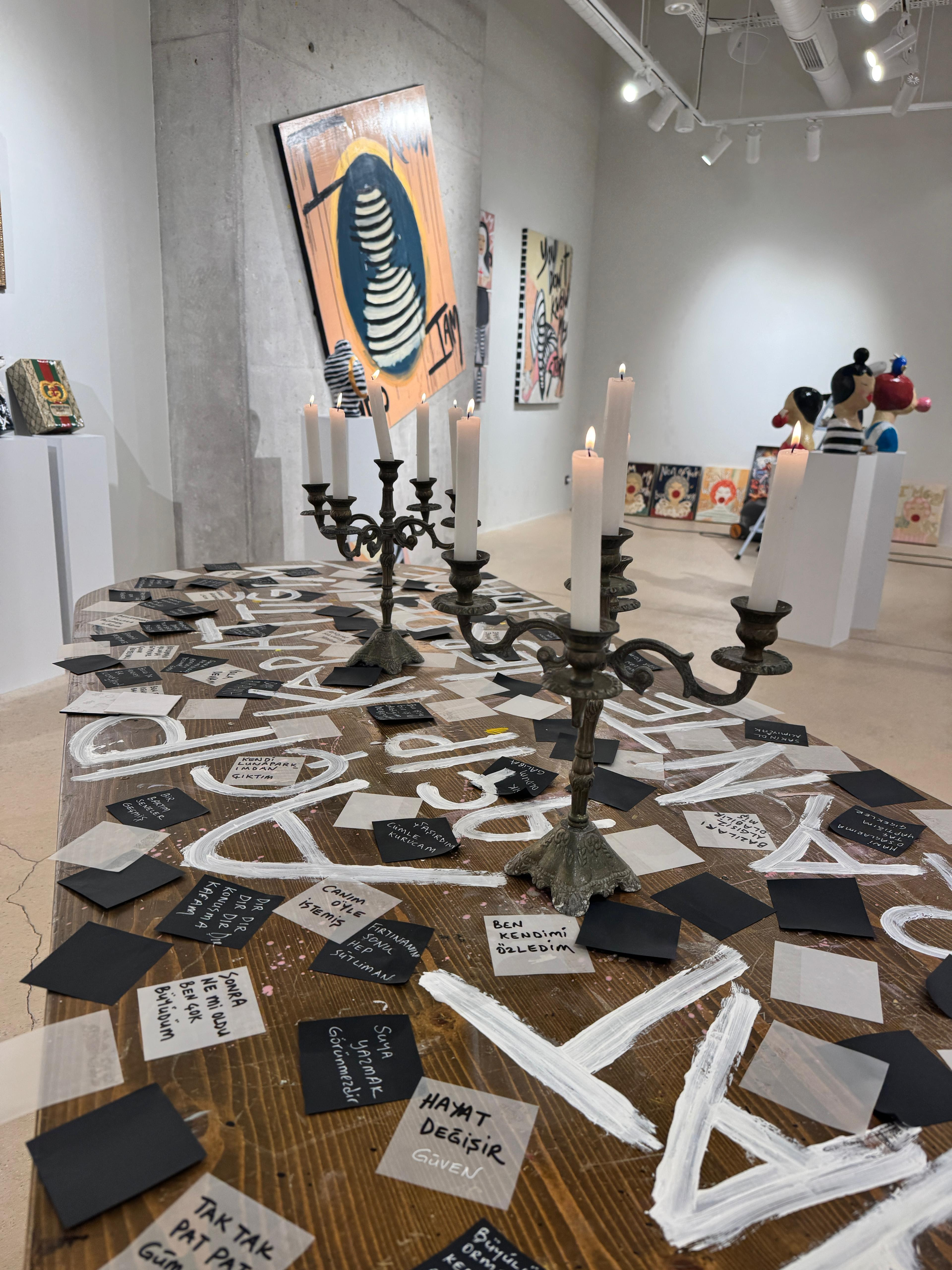 Her bir eserin, sanatçının üretim sahnesinin başka bir perdesini araladığı sergide yer alan yapıtlar, kendi dönemlerinin izlerini taşımaya devam ederken yan yana geldiklerinde ise yeni çağrışımlar, yeni bağlantılar ve ortak bir ritim oluşturuyor. Malzeme, renk ve söz arasındaki geçişler, sanatçının yıllara yayılan pratiğinde hep var olan o içsel tempoyu duyulur bir akışa dönüştürüyor.